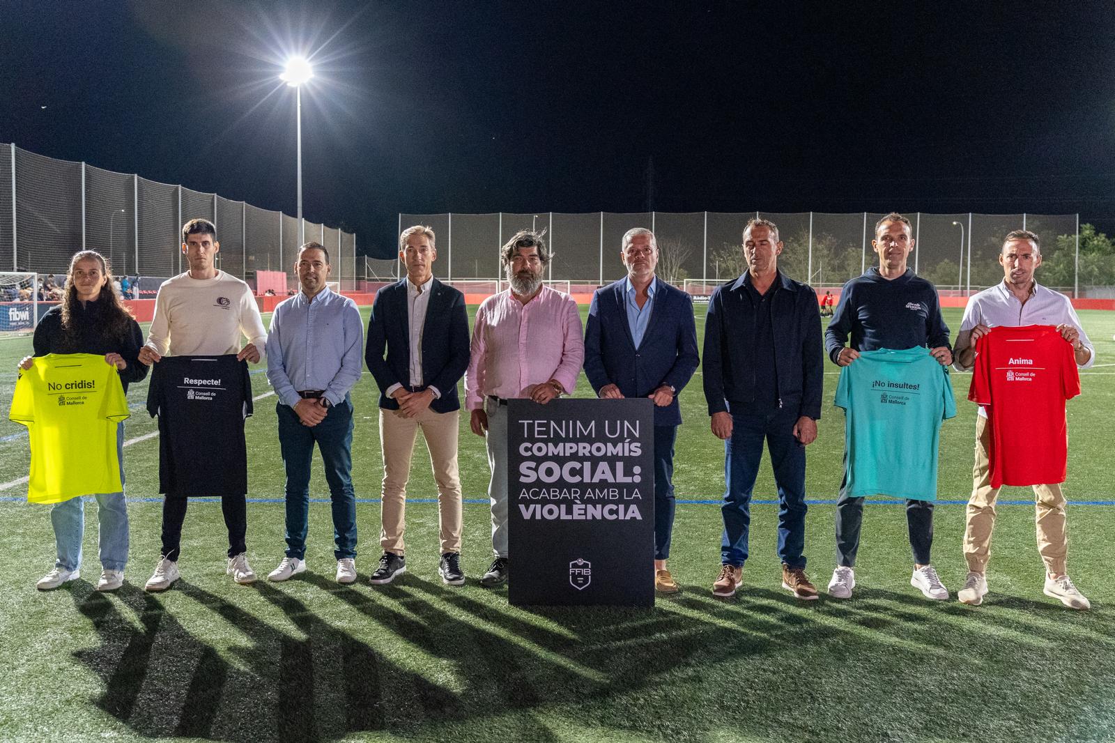 Prevenir y combatir los gritos, los insultos, las interpelaciones a los árbitros o actitudes agresivas en campos y gradas. Este es el objetivo de la campaña que el Consell de Mallorca y la Federación de Fútbol de las Islas Baleares (FFIB) impulsan en el circuito de fútbol base. Bajo el lema «Tenemos un compromiso social: acabar con la violencia», se ha presentado hoy en la Ciudad Deportiva Antonio Asensio del RCD Mallorca, un nuevo bloque de mensajes en contra de la violencia al deporte base, de la mano de los árbitros de primera mallorquines.