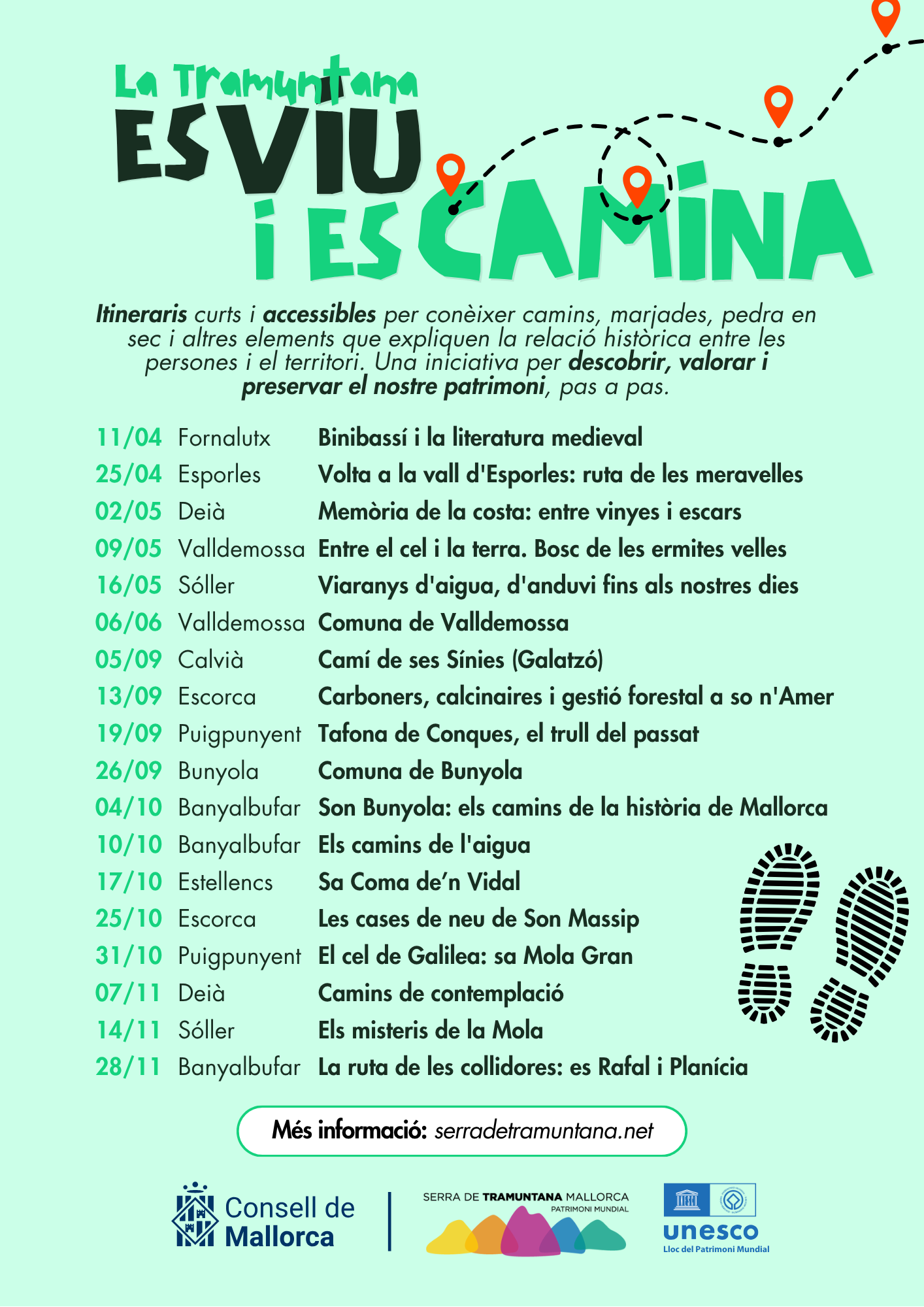 'La Tramuntana es viu i es camina' és un programa de rutes guiades que ens proposa itineraris curts i accessibles per conèixer camins, marjades, pedra en sec i altres elements que expliquen la relació històrica entre les persones i la Serra de Tramuntana, declarada Patrimoni Mundial per la UNESCO el 2011, precisament per aquesta simbiosi, de valor universal excepcional.