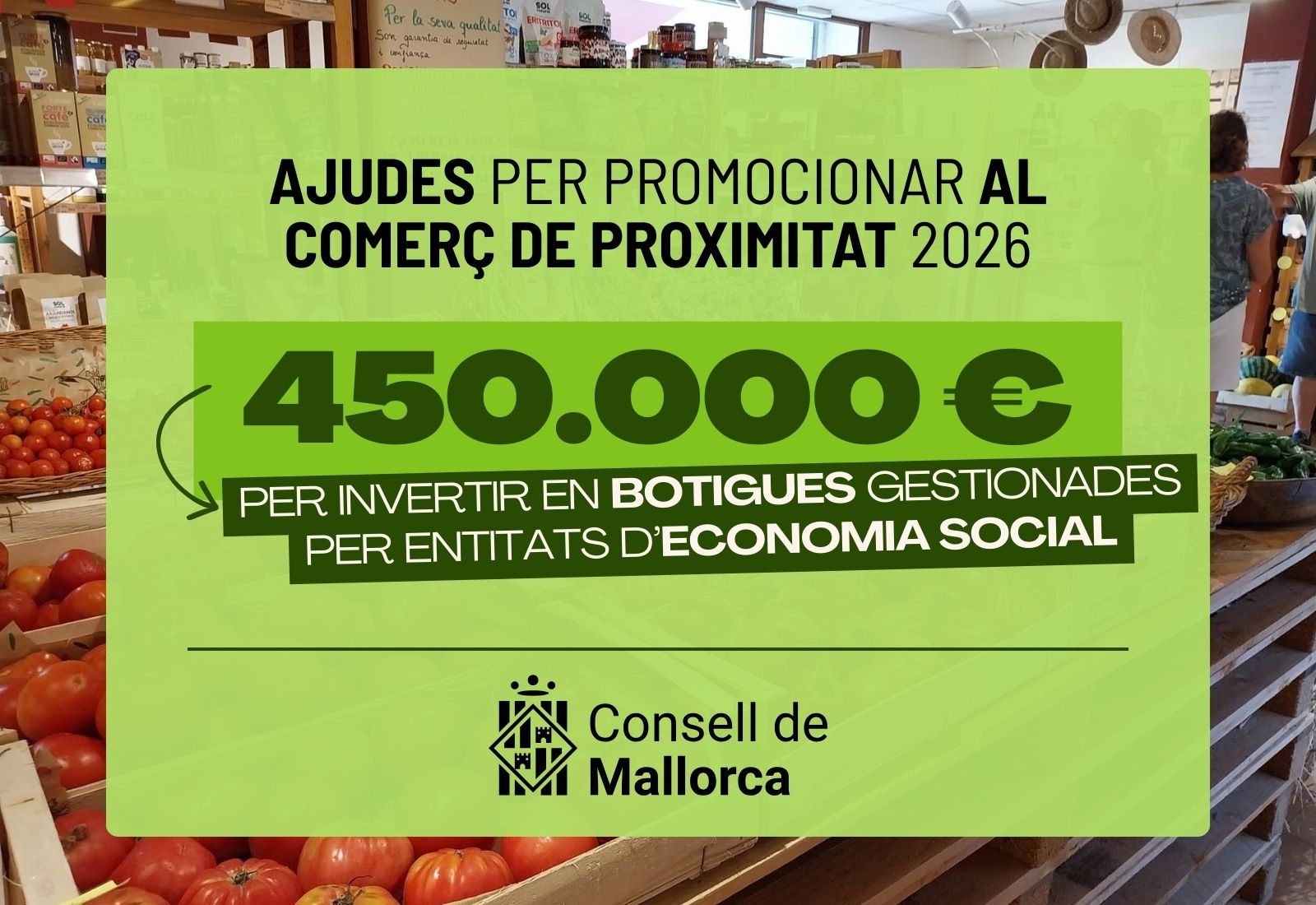 El Consell de Mallorca ha obert una línia d’ajudes per a inversions en botigues gestionades per entitats que promouen l’economia social, per un import de 450.000 euros. Aquesta convocatòria està destinada a empreses, cooperatives i associacions amb punts de venda directa de productes de l’illa.